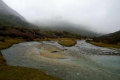 从园区门口骑马到冲古寺有5公里多,沿途都是上山道,但还比较宽,骑马在这林中到上走也别有一番风味因为是雨夹雪的天气,骑马上去后,手脚都冻木了;到了冲古寺下马,我徒步1.7公里到园区电瓶车站,坐80元的电瓶车到珞绒牛场,珞绒牛场三面雪山环绕(北峰观世音菩萨仙乃日(海拔6023米),南峰文殊菩萨央迈勇(海拔5958米),东峰金刚手菩萨夏洛多吉(海拔5958米)),是一处天然的高山牧场和草地,这里是进入牛奶海与五色海的必经之地,由于体力和时间(下午3点要回稻城),我没有进牛奶海和五色海(进去来回要6小时),我在这里拍了一些高山草地风光、深秋河床,这些河床的白色粉末,像雪一样,我开始认为是打霜了,到跟前一看才知是一些白色的沉淀物,成分不知道;在牛场,我一直沿山路向前,越靠近雪山。路越难走,草地上一踩,水往上冒,泥水深一脚,浅一脚;我只好回来,在牛场的休息处,碰到通行的莉莉,等一下又遇上老胡等二人,大家一起坐电瓶车回到冲古寺。